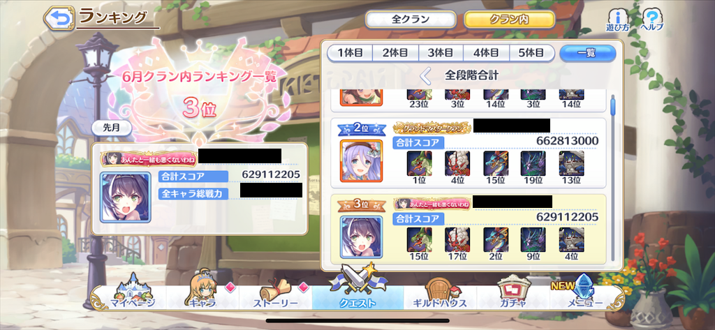 ただし、今月は初日と2日目が土曜日、日曜日となっており、休日の方も多いようで凸消化が早いクランもあったために順位が落ちたとみられます。