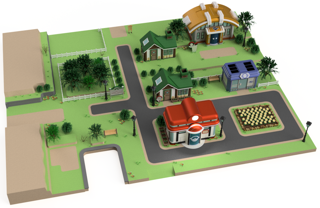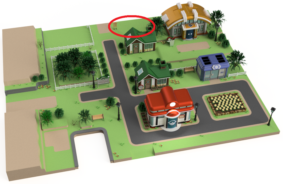 主に以下の画像で左上の高台の自然物配置と、ジム周辺の自然物配置をしました。