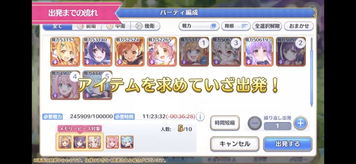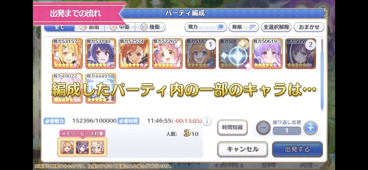 ①キャラを選んで、パーティを編成する(選択キャラの一部はメモリーピースが獲得できるチャンスがあり)