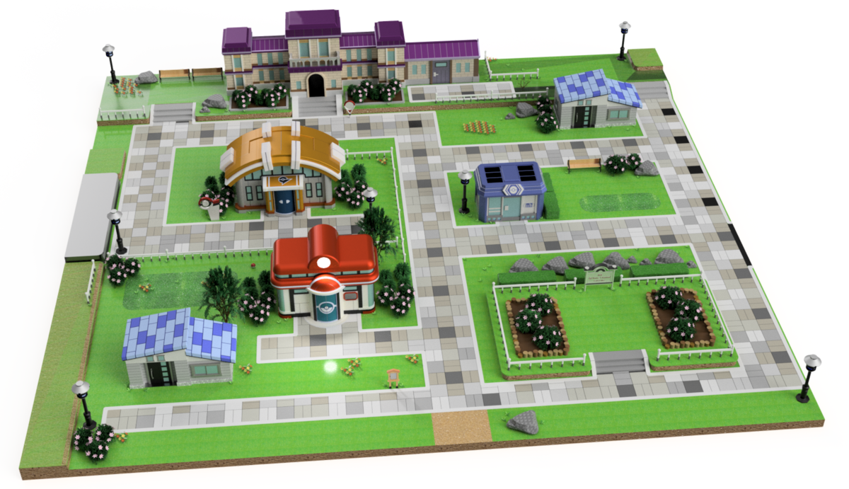 昨日のモデル町の左端を拡張し、高台やニビ科学博物館左端奥に街灯や自然物を配置しました。