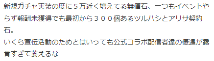 もちろん、課金のみでしかできないわけではないのですが、無課金だとほぼ育成は不可能(その育成素材を取るためには何ヶ月もかかるうえ、環境が変わるので育成できるころには新キャラを取った方がいい始末)なので、当然この後出し告知にはほぼ全ユーザーがぶちぎれました