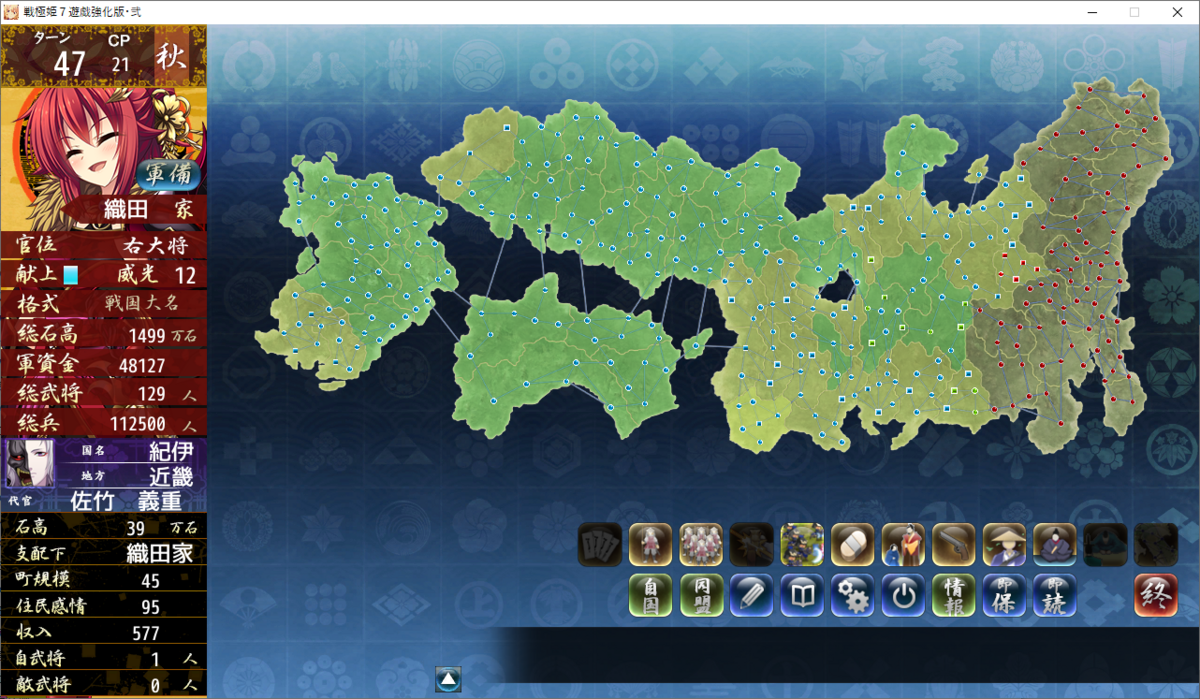 その後も進めて、47ターン(1500万石)程で関東地方と東北地方以外を除くほぼ全てを支配下に。