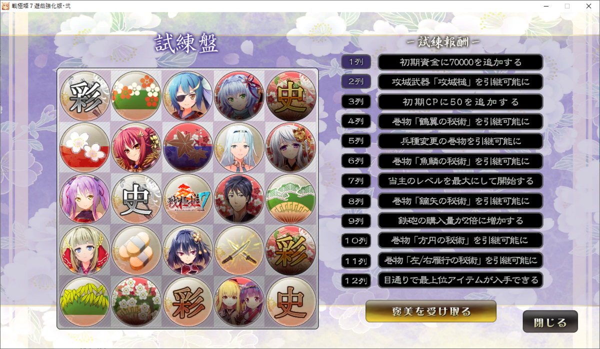 前作6と同じく、「試練盤」があります(条件クリアで1マスずつ空いて、列が揃うと褒美が貰えるビンゴ)。