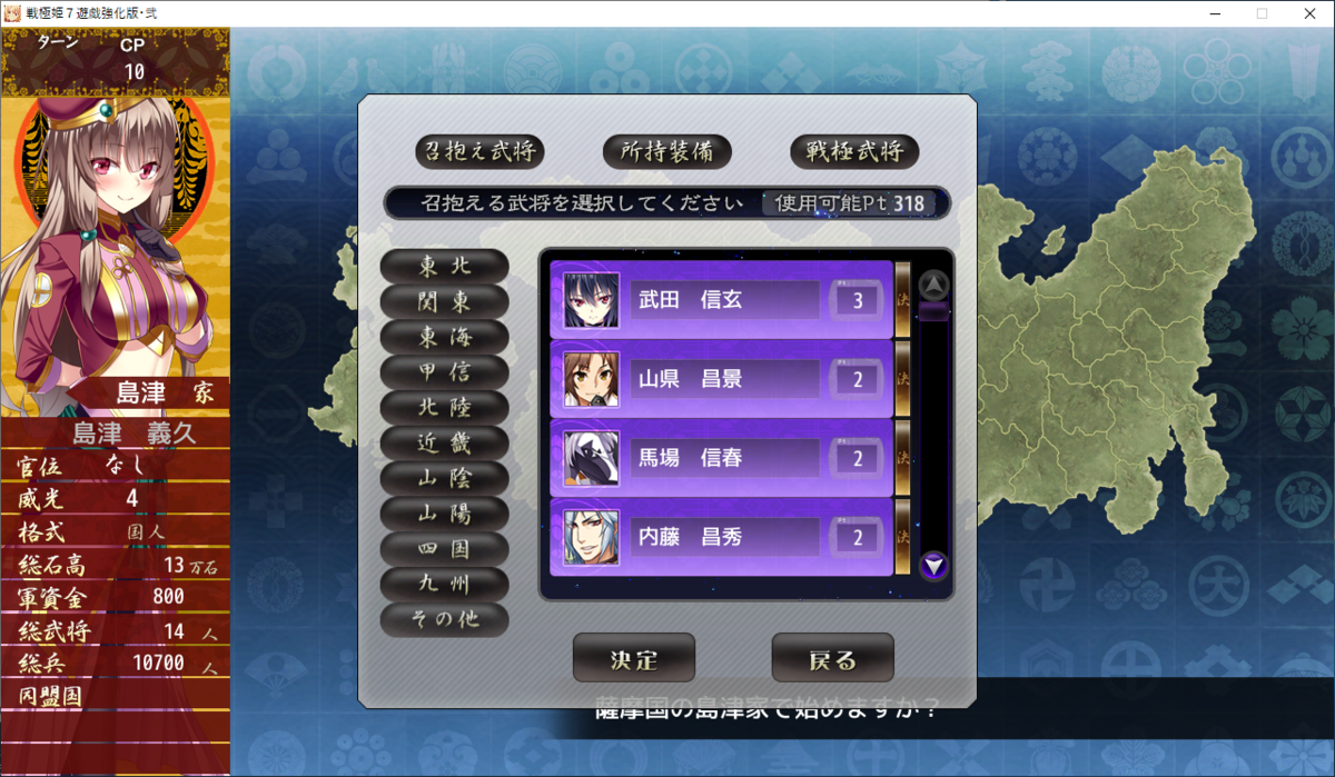 島津義久は統率が低めの代わりに内政面が優れていて、かつ武将レベル10なのでCPが多めです。