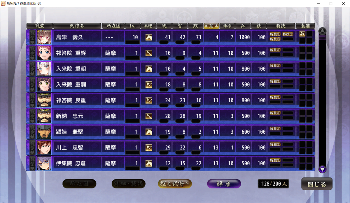 初期からいる祁答院や伊集院、新納、川上、入来院、頴娃といった武将の兵を立花宗茂や高橋紹運、足利義輝、伊達政宗などに割り振ります。