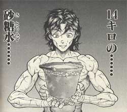 漫画「グラップラー刃牙」の最凶死刑囚編で毒手を食らい、大擂台賽編で復活を遂げる時に「14キロの砂糖水」の描写があります。