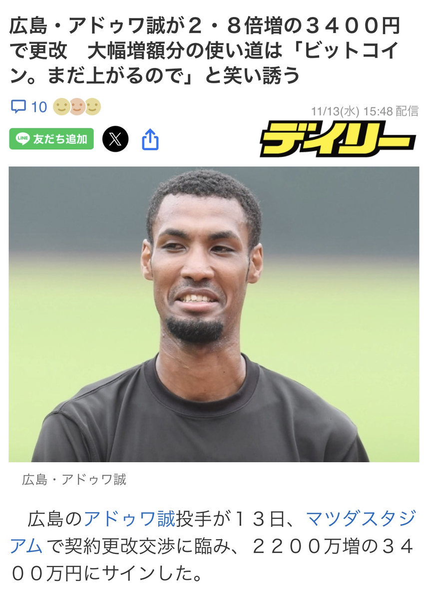 広島カープ所属の投手、アドゥワ誠の年俸が「2.8倍増の3400円」と誤植されました。
