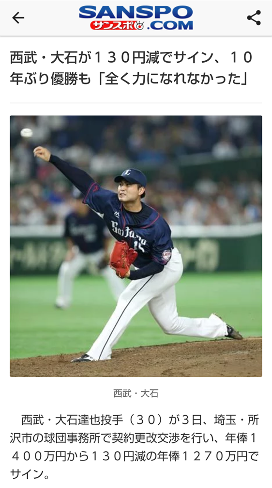 サンスポの記事に「西武の大石が1400万円から『130円』の減俸」と誤植されました。
