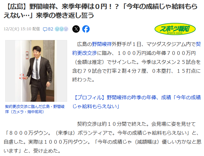 実際は記事にある通り、8000万円から1000万円ダウンの7000万円で契約更改です。