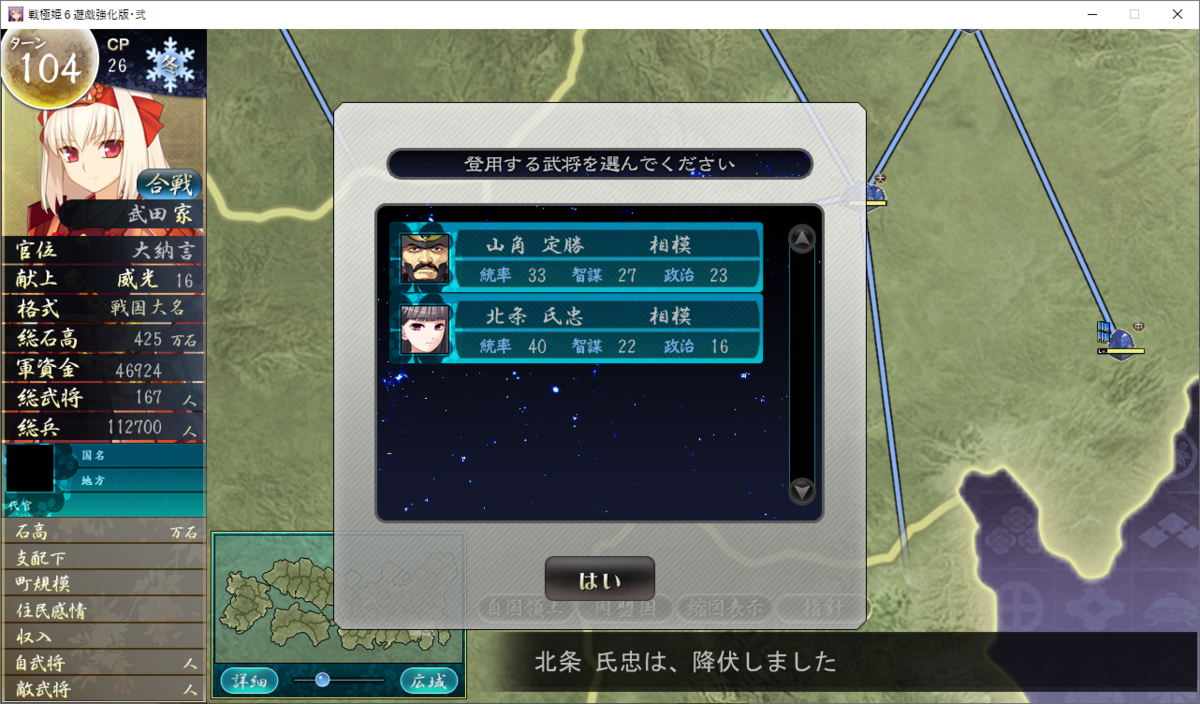 はっきり言って毎度武将レベルアップさせるのが面倒なので(今回でも70ターンくらいはレベル上げの期間でしたからね)、さっさと最初から配下に加えてレベル上げしたいです。
