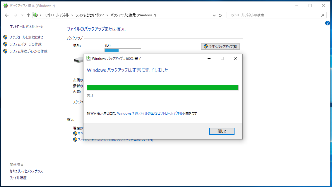 「システムとセキュリティ」→「バックアップと復元(Windows7)」をクリックして「今すぐバックアップ」をクリックするとバックアップが開始されます。