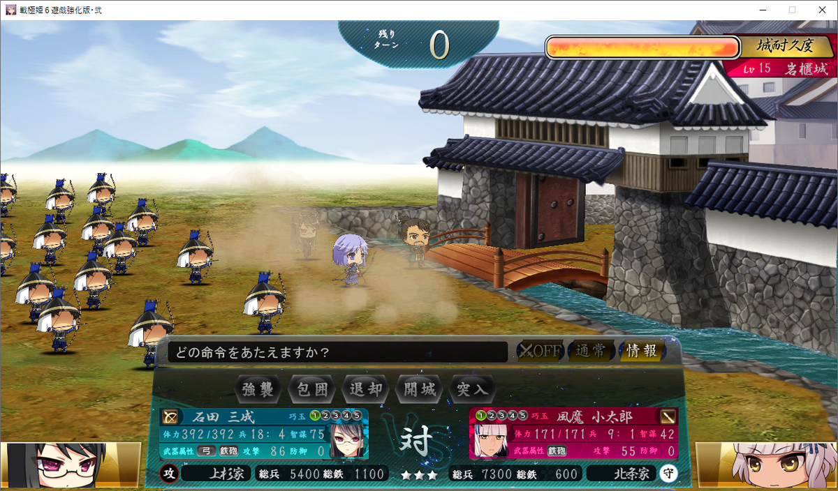 相手が2000兵もある以上、4ターン以上かけて野戦で兵を削り取り、拮抗以下にするしかなさそうですね。