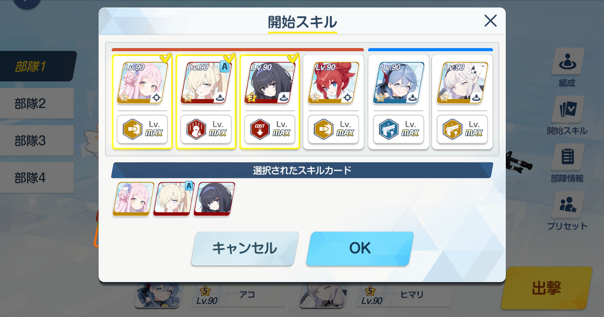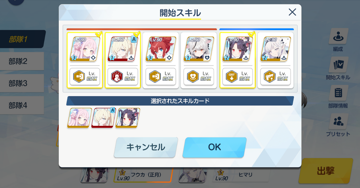 3コス:水着カンナ→正月フウカをミカに使用→ミカ(ここでココナのスキル効果によりコスト軽減状態になっているはずです)