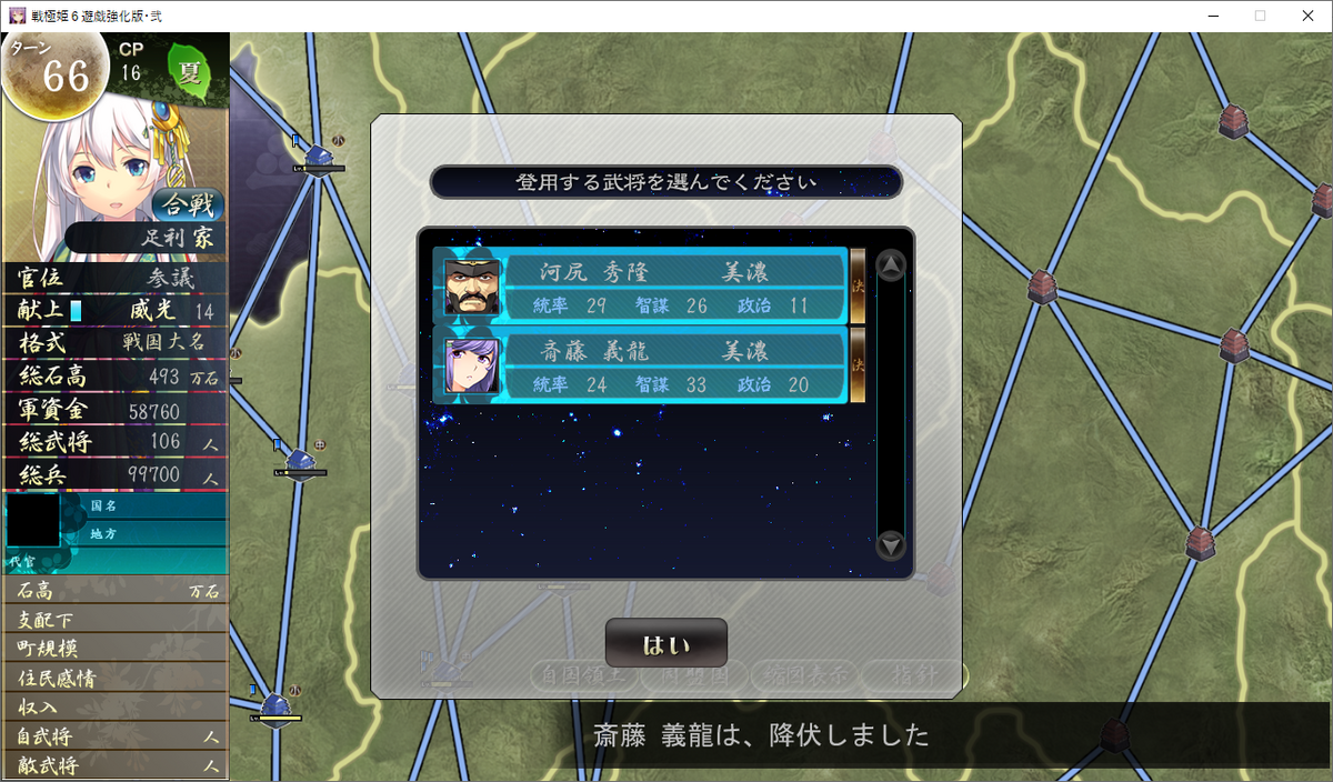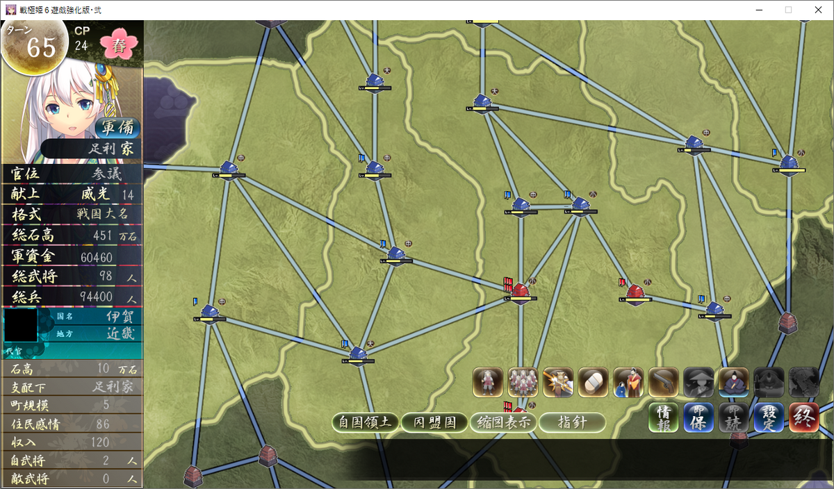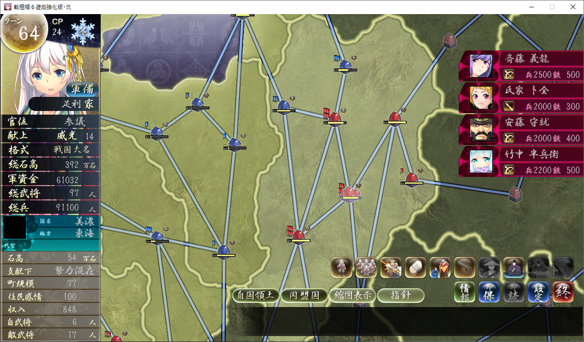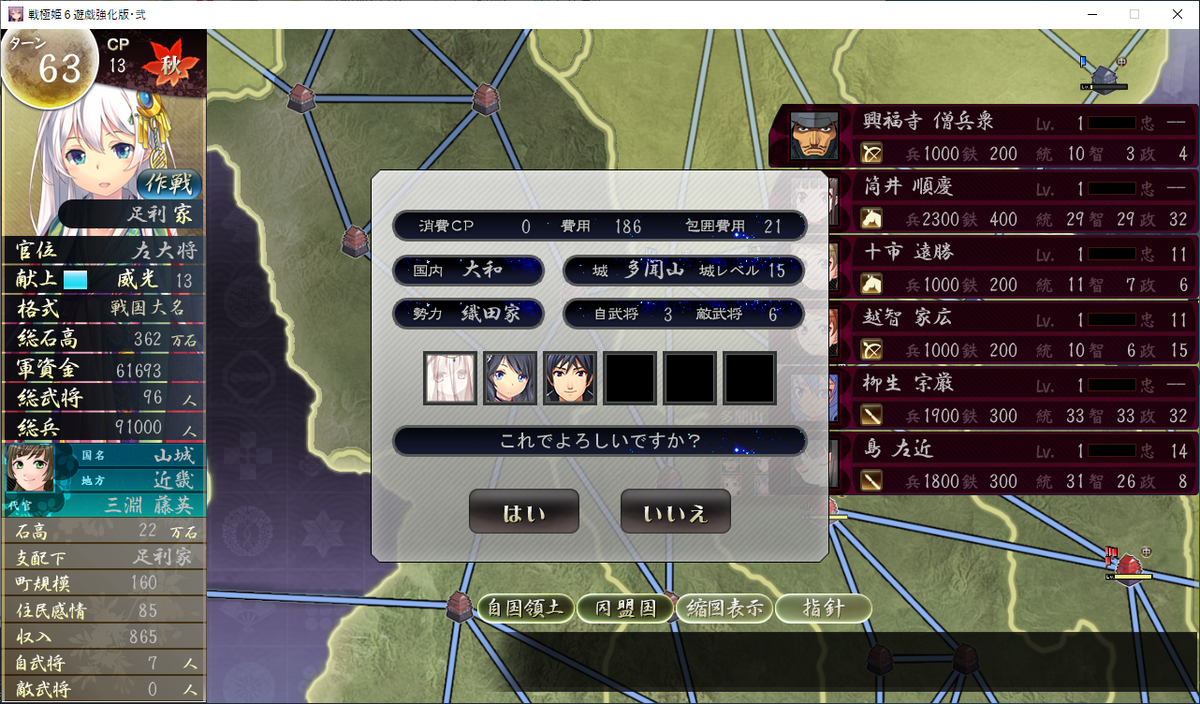 前ターンで元・筒井家を壊滅させたので、戦力をうまく配分しましょう。
