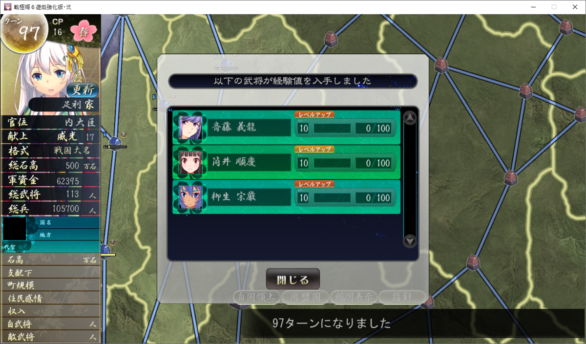 最も加入が遅かった斎藤義龍には毎ターンの作戦フェイズで「計略」をして経験値を多く稼いでもらっています。