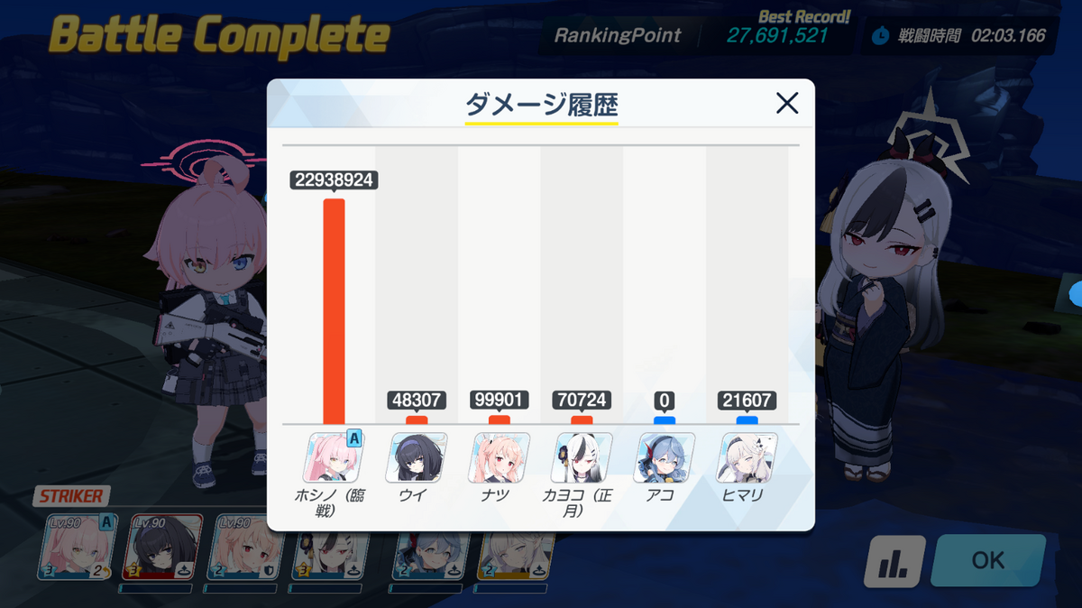 倒せなくてもバフかけ(カヨコ、アコ、ヒマリ)→ホシノのとどめで2765万は出せます。