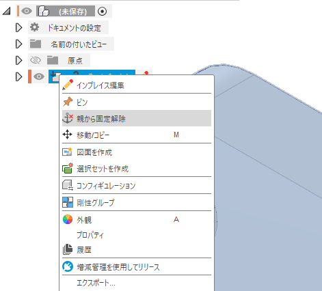 このエラーについて調べてみると、バージョンアップによって、アセンブリ対象部品が初期では自動的に「親に固定化」されているのが原因のようです。