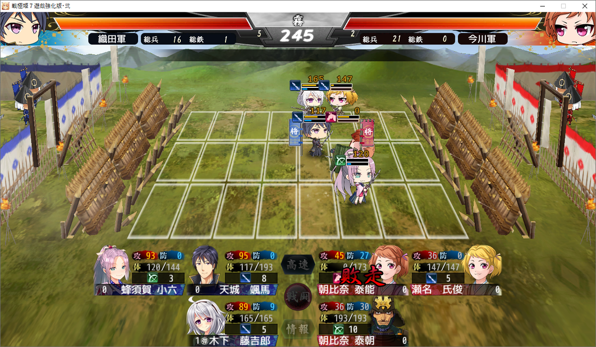 さすがに防御側だったので突撃一発で終わりませんでしたが、信長突撃→丹羽長秀の弓遠距離攻撃でこちらのターンのみで終わりました。