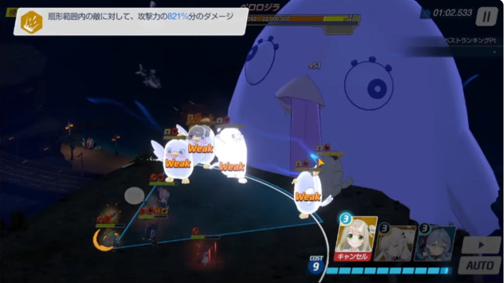 まずペロロジラは範囲攻撃でいかに多くの「ペロロミニオン(および本体)をまとめて攻撃できるか」が重要です。