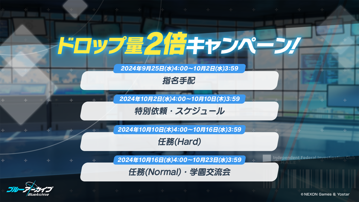 シャーレの総決算および任務Area27開放とともにHardドロップ2倍が開催されます。