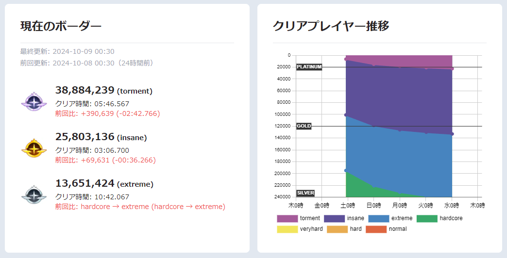 10/9の0時時点で「22600人ちょっと」がTormentをクリアしていて、チナトロはTorment2凸でないと厳しい様相です。