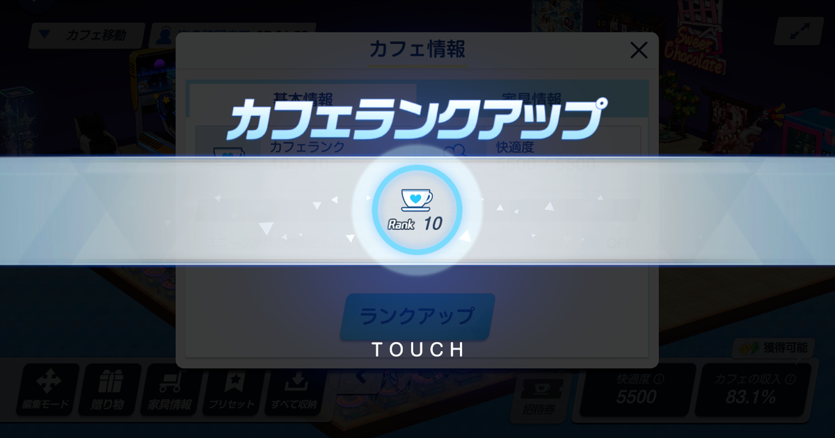 カフェ1号店の快適度を「5500」にアップできます。