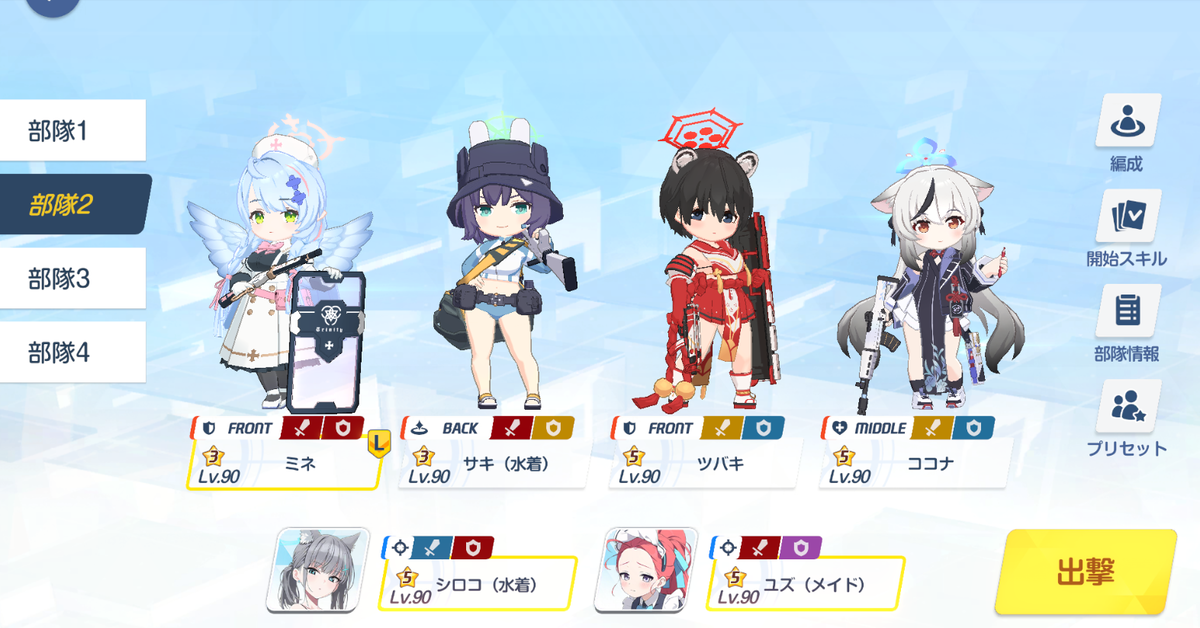①水着シロコ(開幕でパーティ全員のコスト-1。初回1回限り)