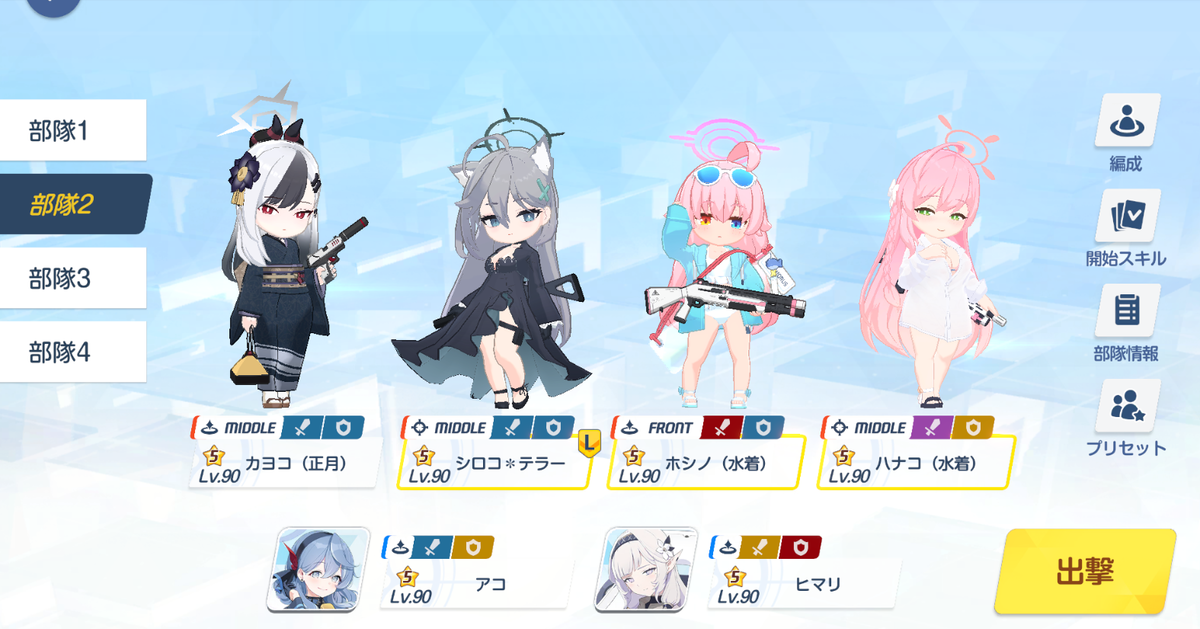 正月カヨコで神秘特効を付与、アコとヒマリで会心と攻撃力アップで一気に叩きこむ編成です。