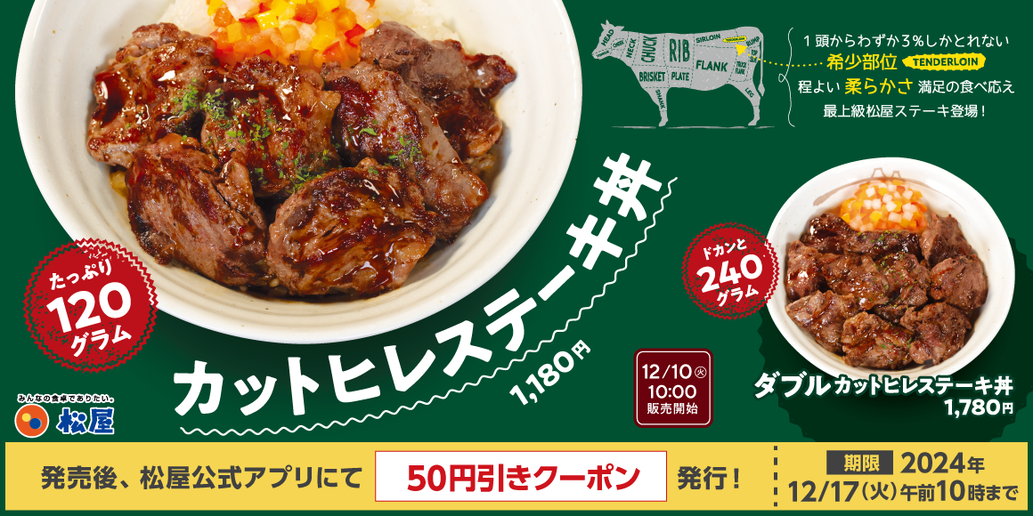 2024年12月10日(火)の15時より松屋で新作丼メニュー「カットヒレステーキ丼」が発売されました。