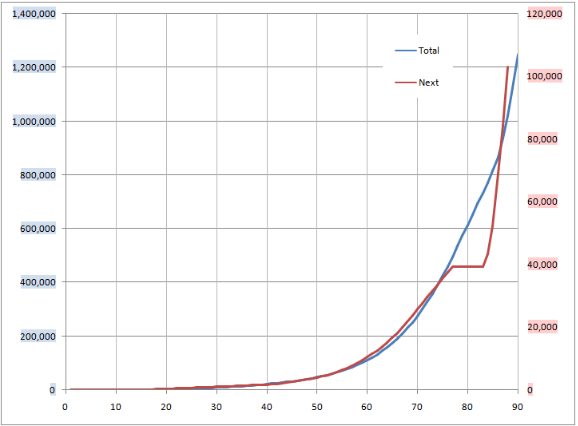 赤線を見ての通り、80半ばから爆発的に必要な経験値が増えます。