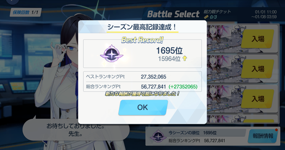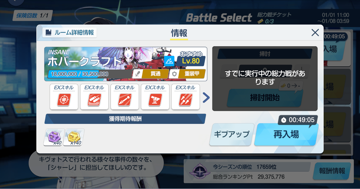この正月という時期にまとめて消化できる大決戦ではなく総力戦ははっきり言ってつらい(自分も明日から遅めの帰省をするので、ゲームに割ける時間がぐっと減ります)ですが、まあいざとなればコインが減るのを覚悟でデイリーInsane消化をするかもしれません。