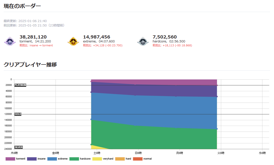 1/6(月)の19:30時点では19918人がTormentクリアで、Tormentクリア者増加は緩やかではあるもののInsane枠は100人を切っています。