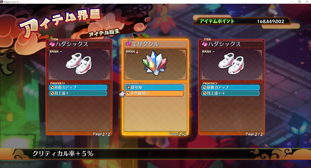 3回ほど転生させたら、狙いの特性である「正中線狙い(クリティカル率+5%)」が出ました。
