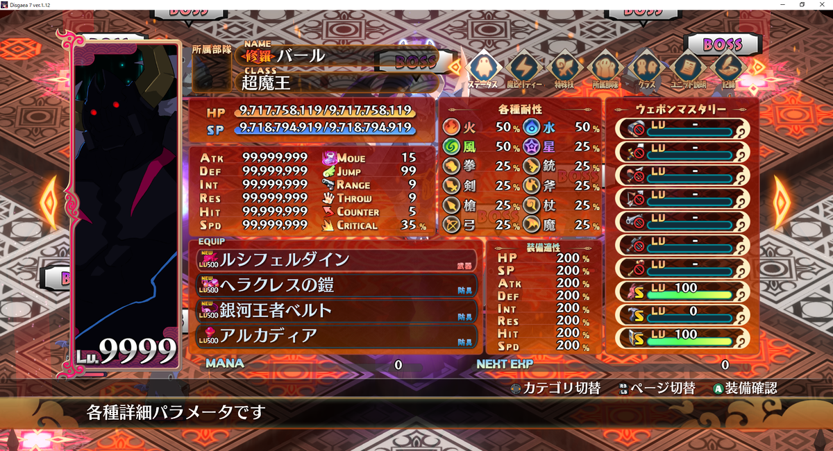 当然のごとくATK~SPDはカンスト99999999です。
