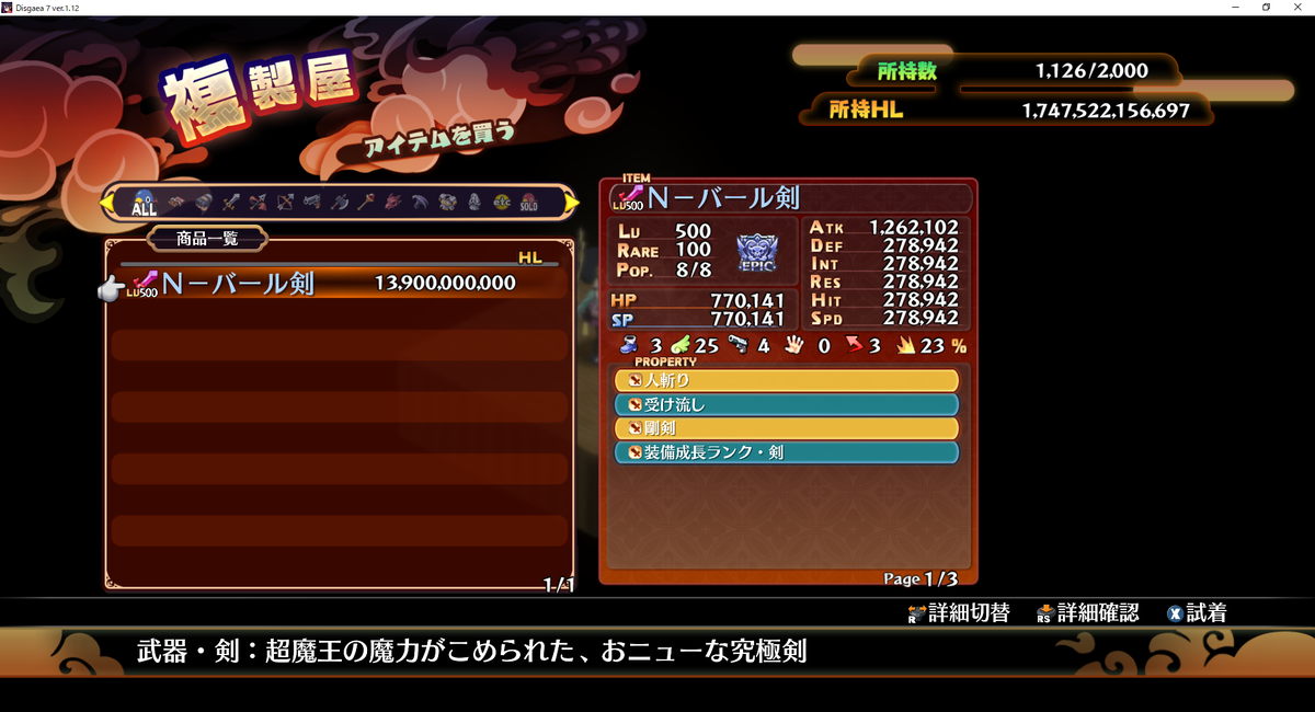 N-バール剣(レアリティエピック、アイテムレベル500)のお値段は「139億ヘル」でした。