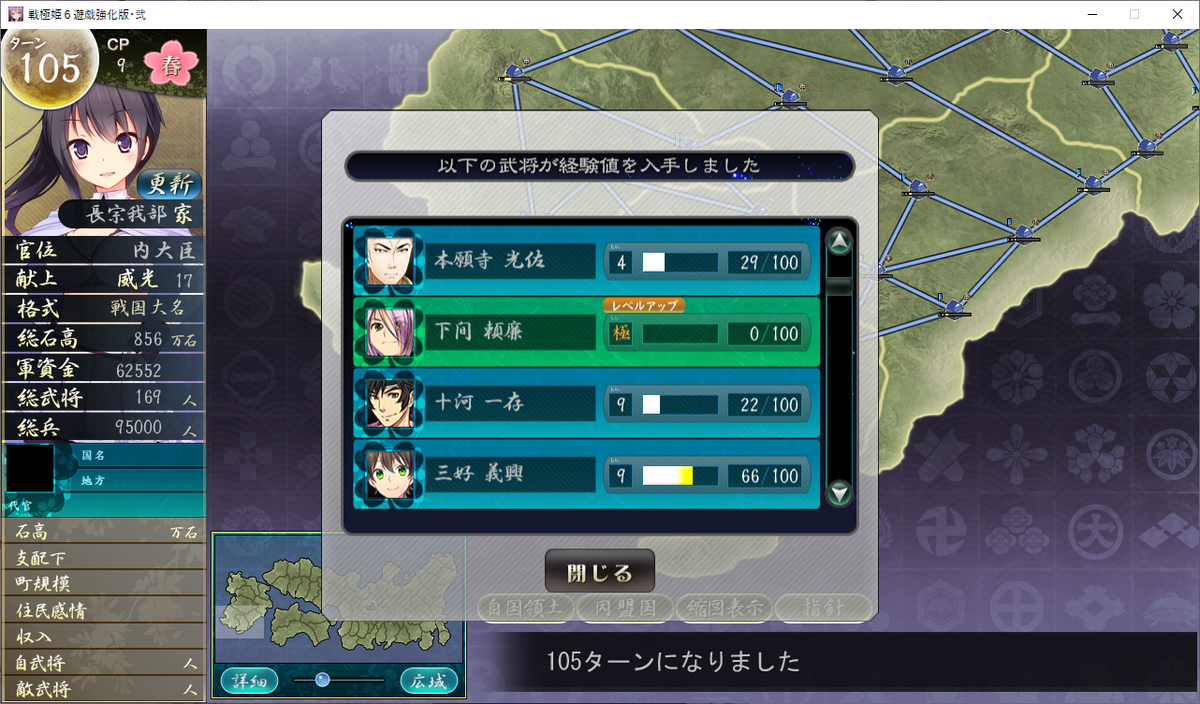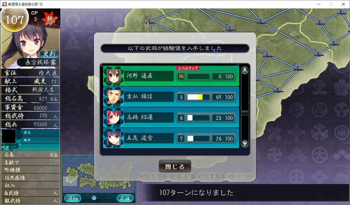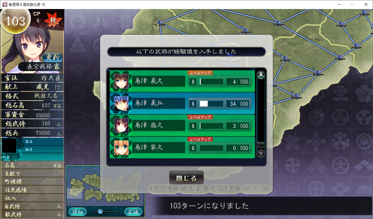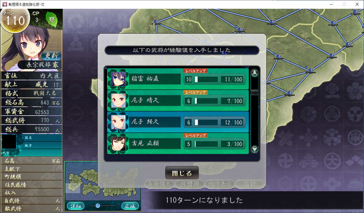このターンで石見正頼がレベル5になって、ようやく折り返し地点です。