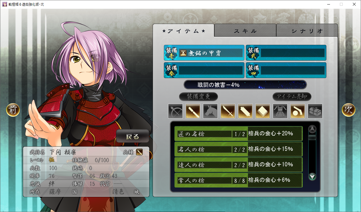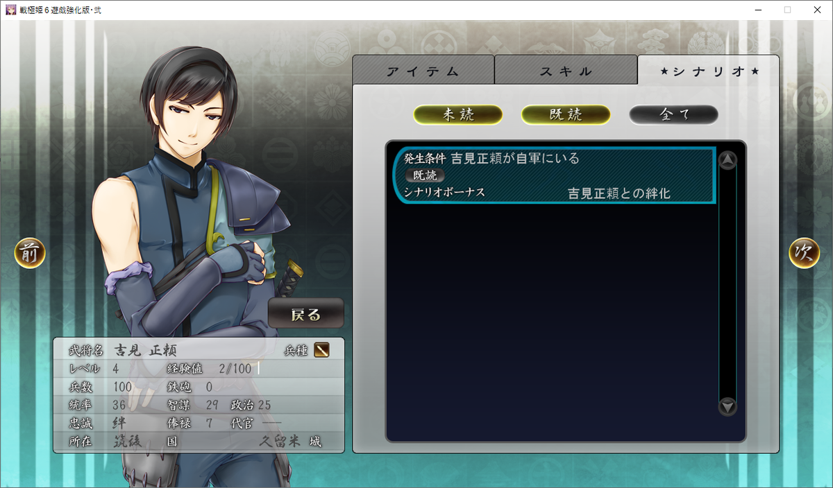 代官の献上物で鍛錬の巻物が手に入ったので、一番レベルの低い吉見正頼に装備。