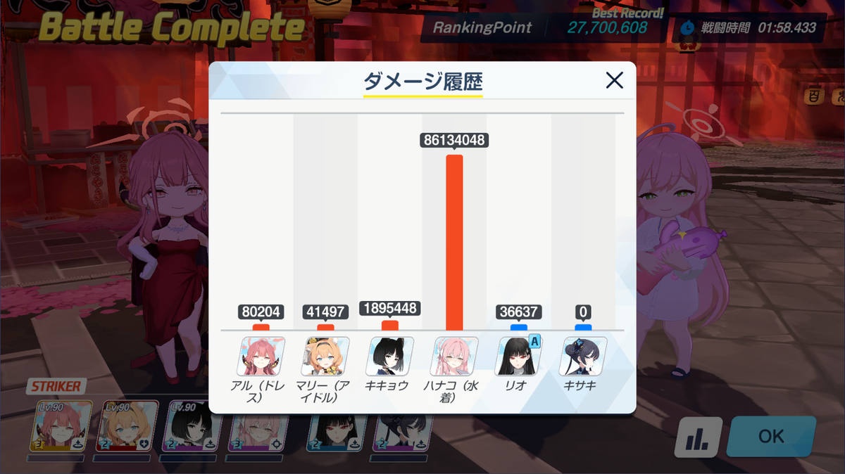 お残しがある場合はリオやドレスアル、キサキなど適当にスキル回しして水着ハナコを撃ってください。