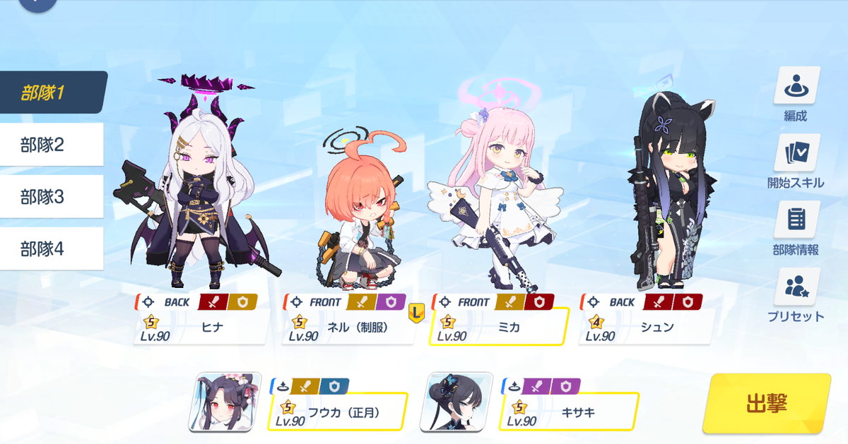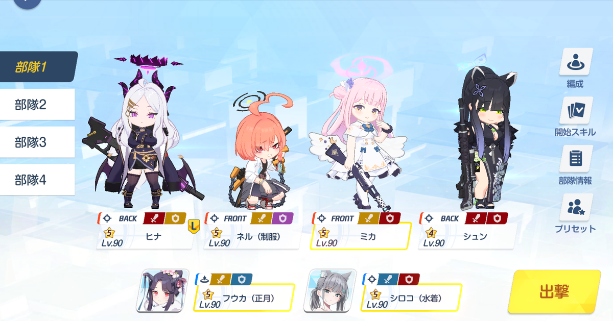 上位先生の編成は以下のようになっています(水着シロコ→キサキ)。