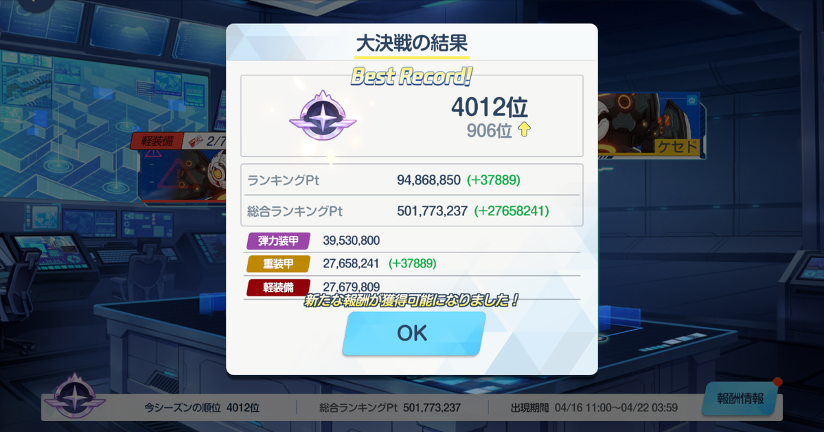 重装甲のスコアを3万ほど改善して900位もアップです。