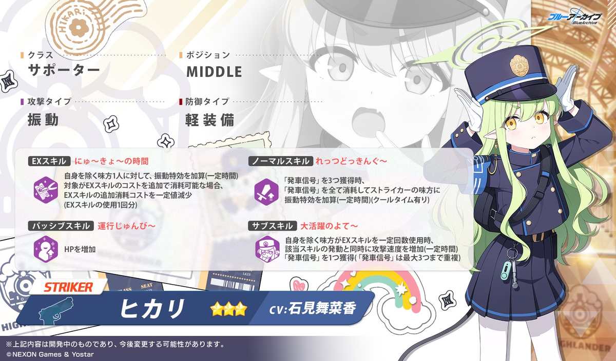 「発車信号」を3つ獲得時、「発車信号」を全て消費してストライカーの味方に振動特効を29%加算(25秒間)