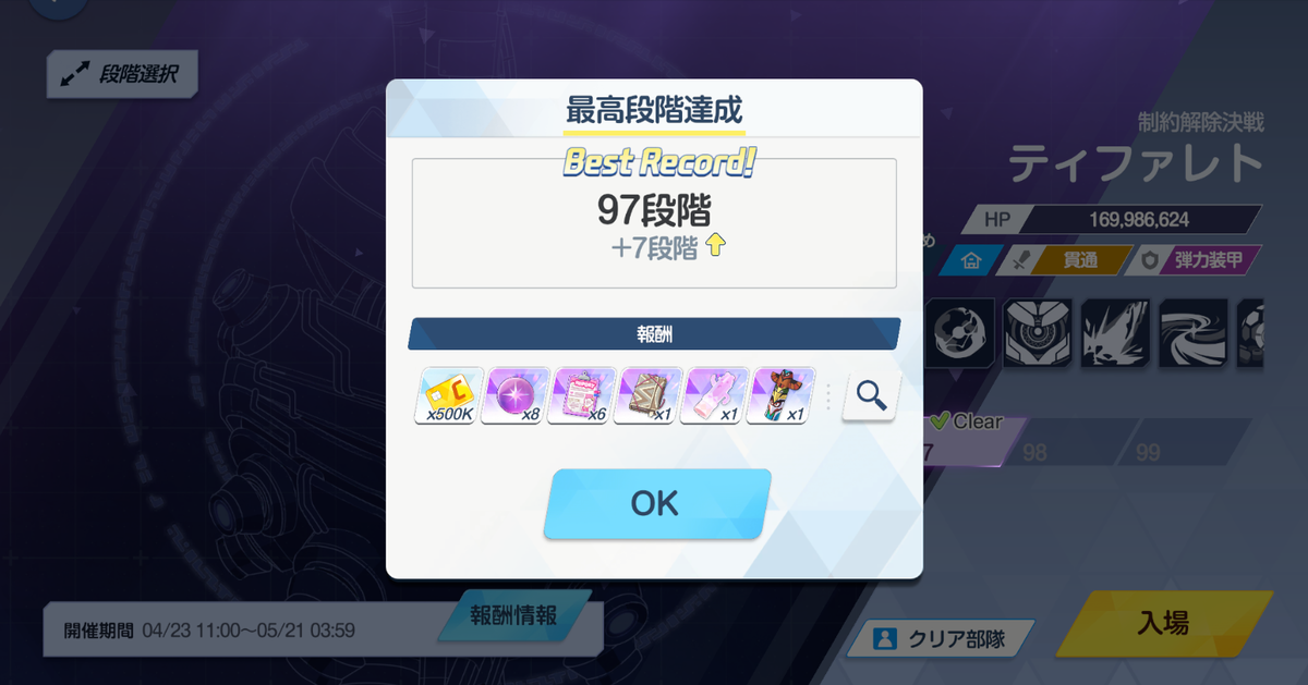 4/29の深夜にチャレンジしていたのですが、午前4時を跨いでしまい、クリアと同時に更新が入って「ミス扱い(なかったこと)」にされました。