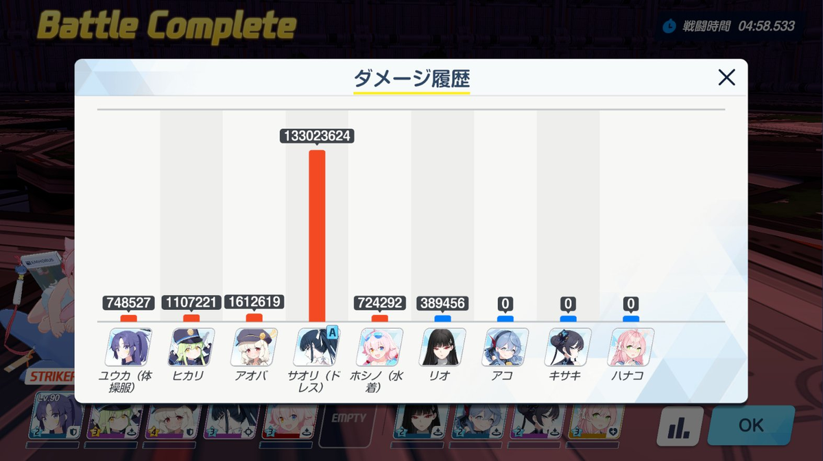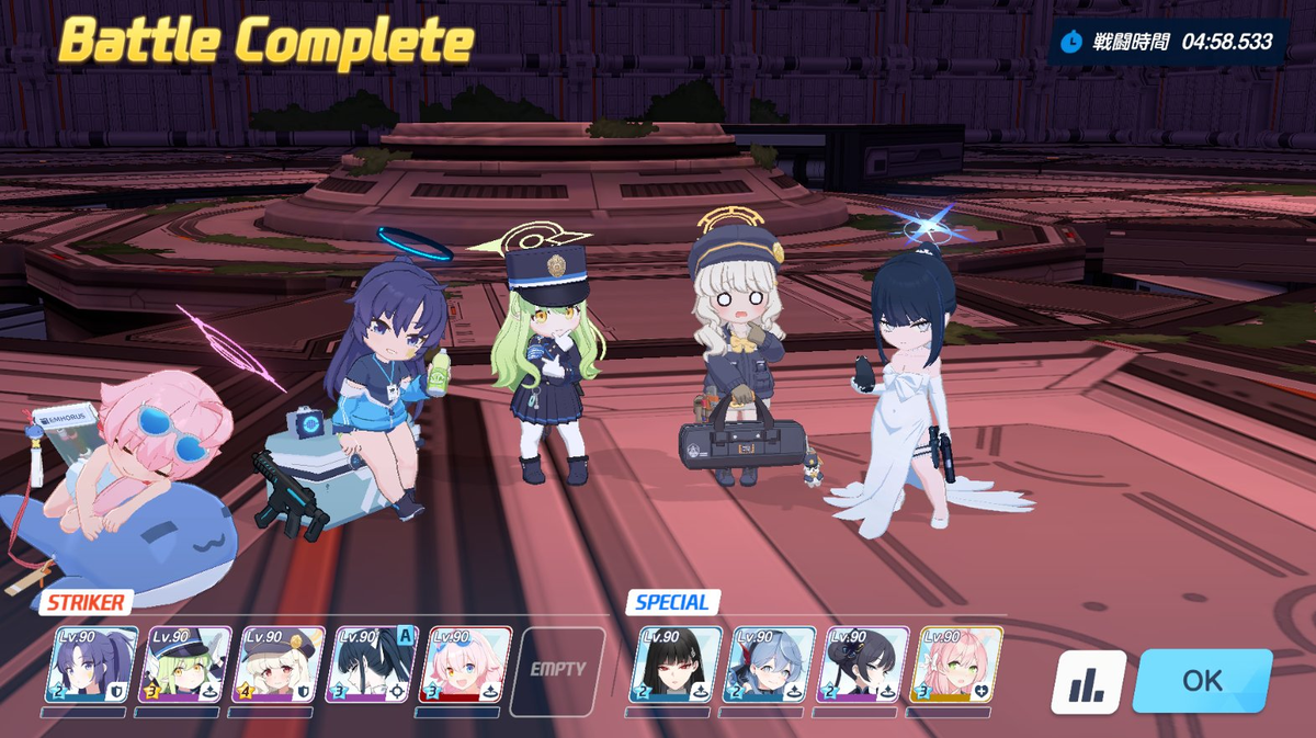 ここに、水着ハナコ採用なら回復補助でココナ、回復要員はハナコか温泉シグレ、シールド付与要員でSTRIKERなら体操服ユウカ、SPECIALならカエデといった感じです。