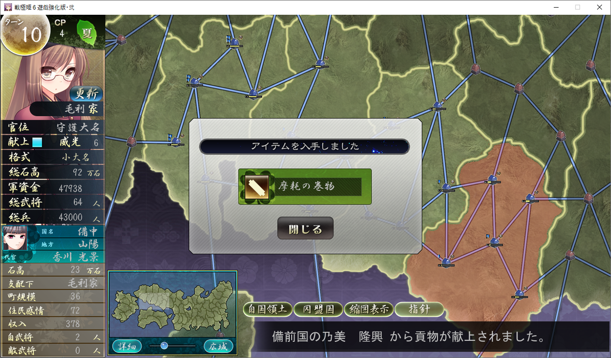 石見と周防を完全制圧下にすると、次は本州最西端である長門が開放されると思うので、それを見据えて武将などの整備と配置をしておくと良いでしょう。