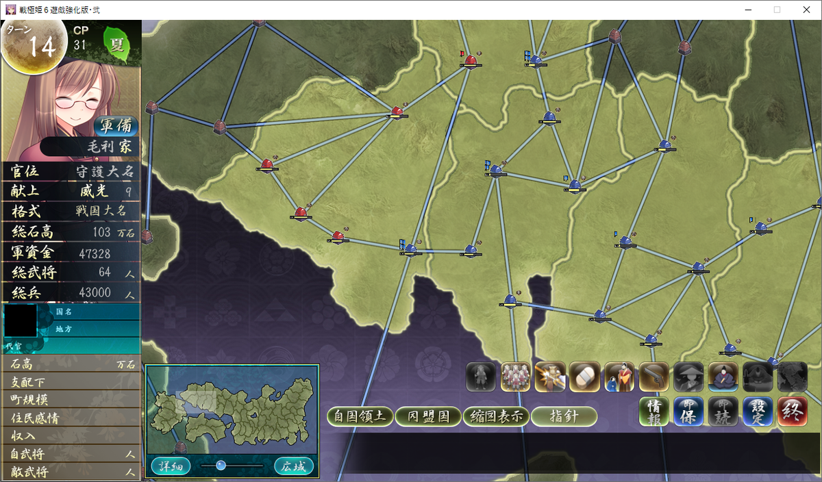 統治4ヶ国の内政はばっちりで、石見と周防への侵攻で戦国大名に格付けアップ。