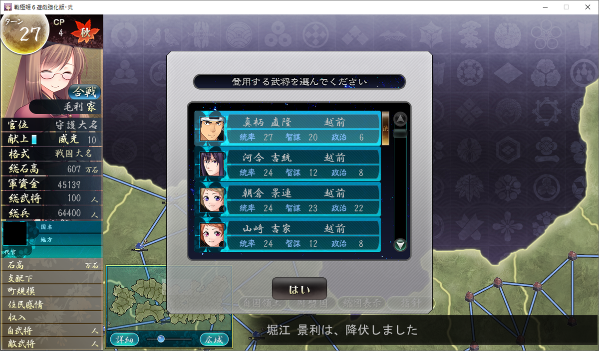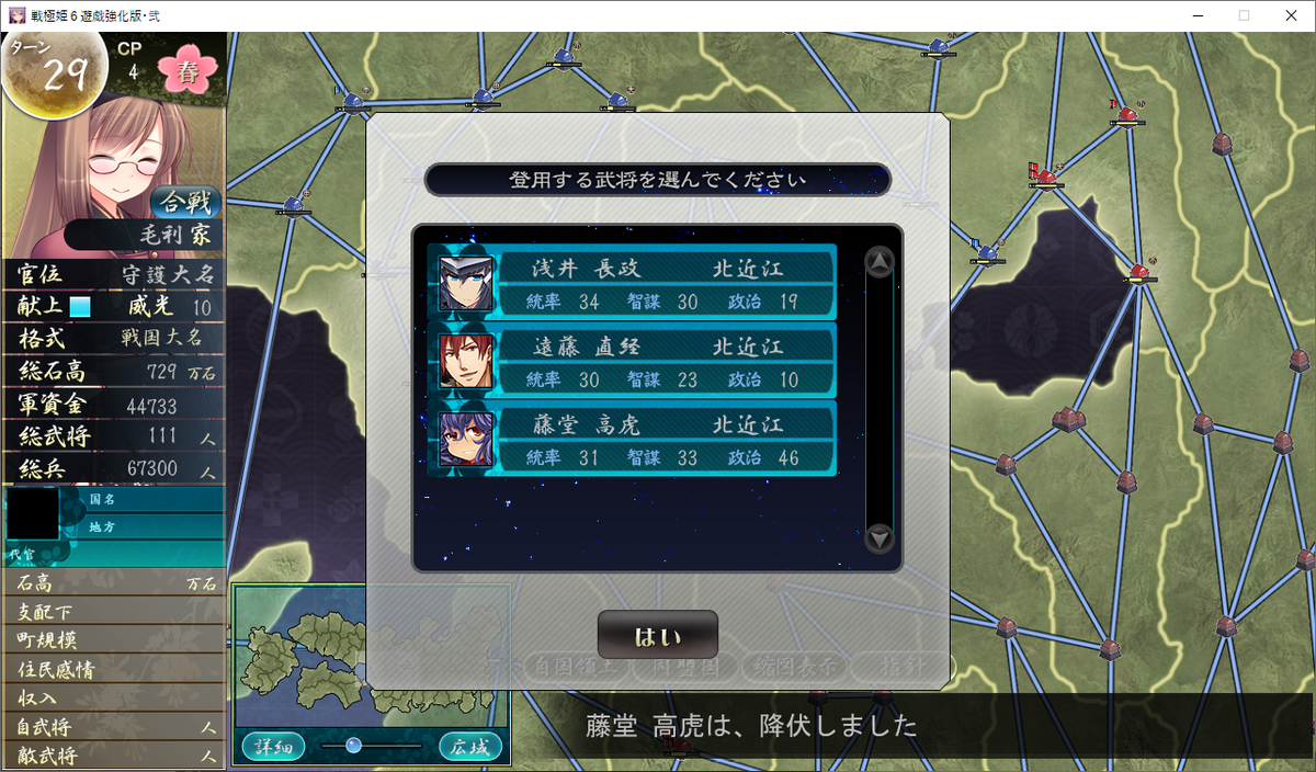 隣接する城が増えないようにして、必要であれば降伏した武将にも兵を少しずつ割り振っていきましょう。