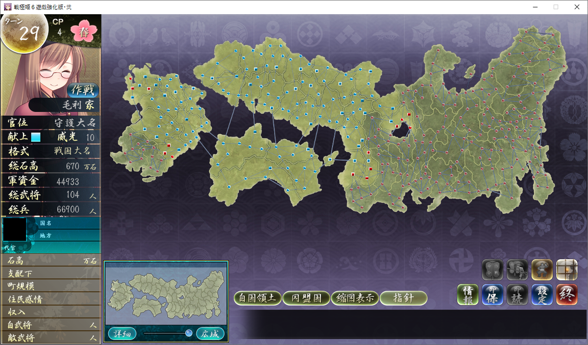 龍造寺家と新納家(旧島津家)、朝倉家、本願寺家、森家(旧三好家)を蹴散らせば楽なのですがね(後は畿内の六角家と浅井家が次のターゲットです)。