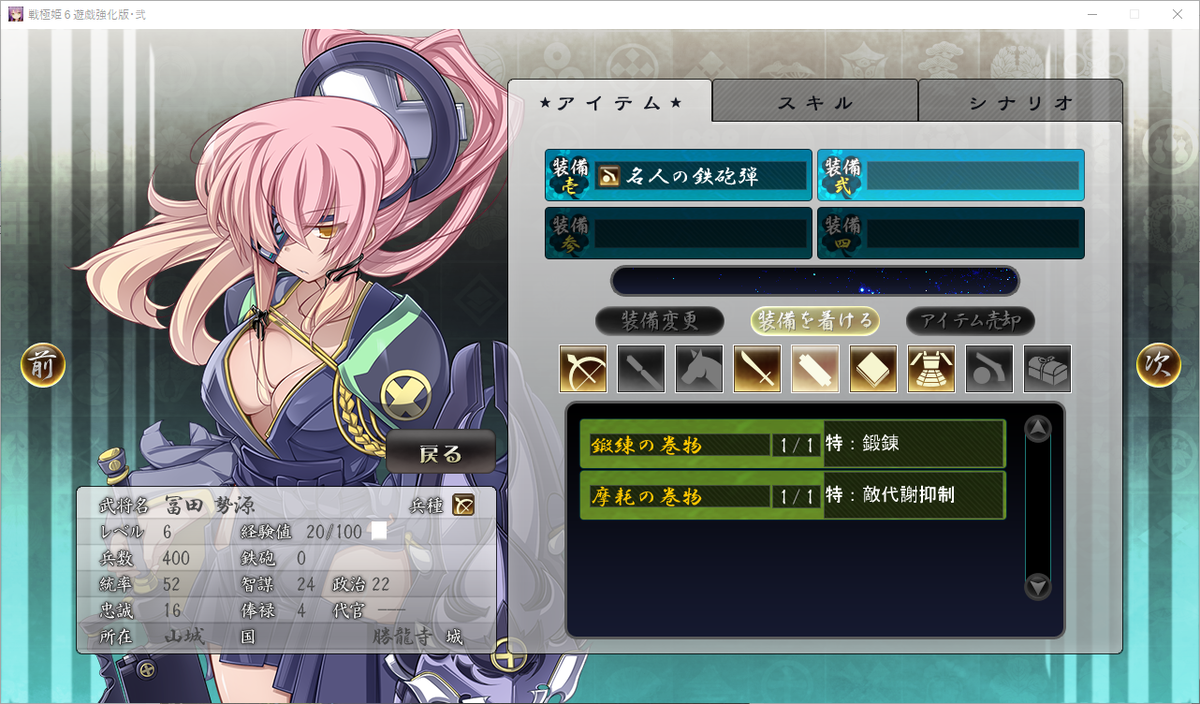 とは言っても後継作の戦極姫7と違い「入手経験値+20%」であって、通常の鍛錬では8経験値の20%=1.6で、端数切捨てなので「1」しか増えません(戦極姫7では+100%の2倍)