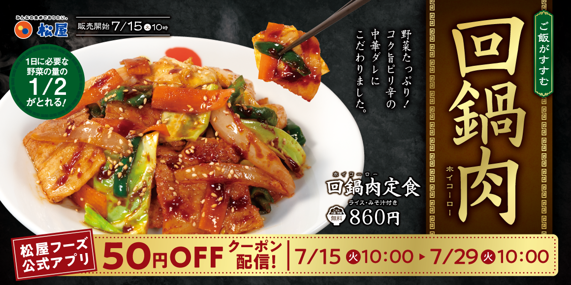 本日2025年7月15日(火)の10時より松屋で中華料理メニュー「回鍋肉定食」が発売されました。