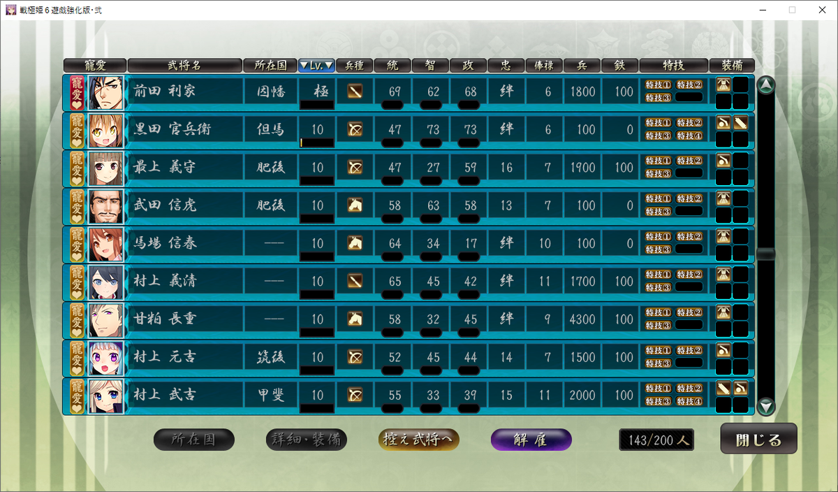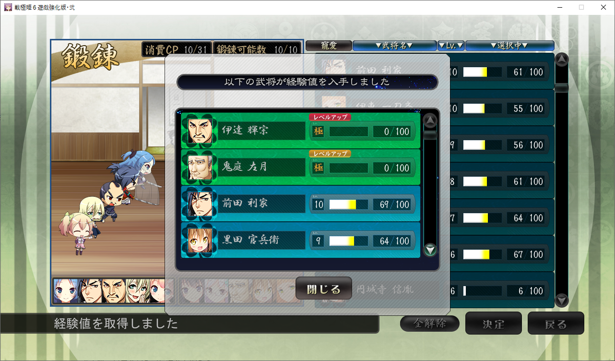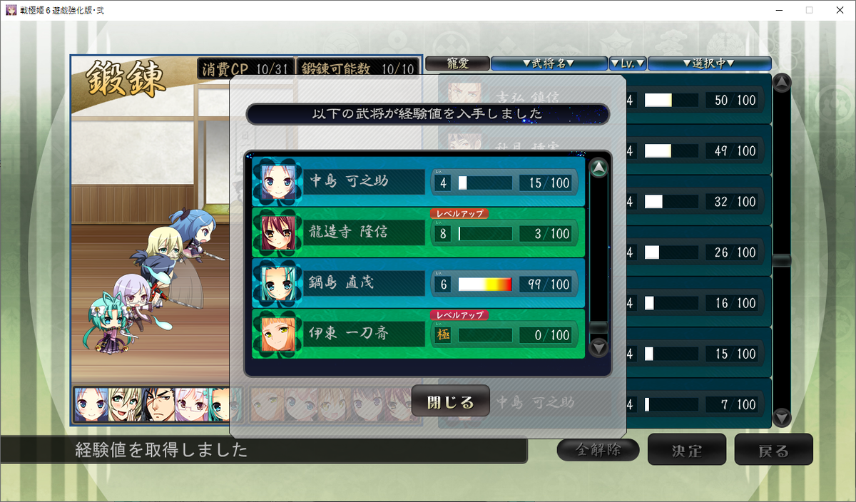 前回の記事で書いたように、必要はないもののレベル10の武将をレベル極にまでキリよく上げます。